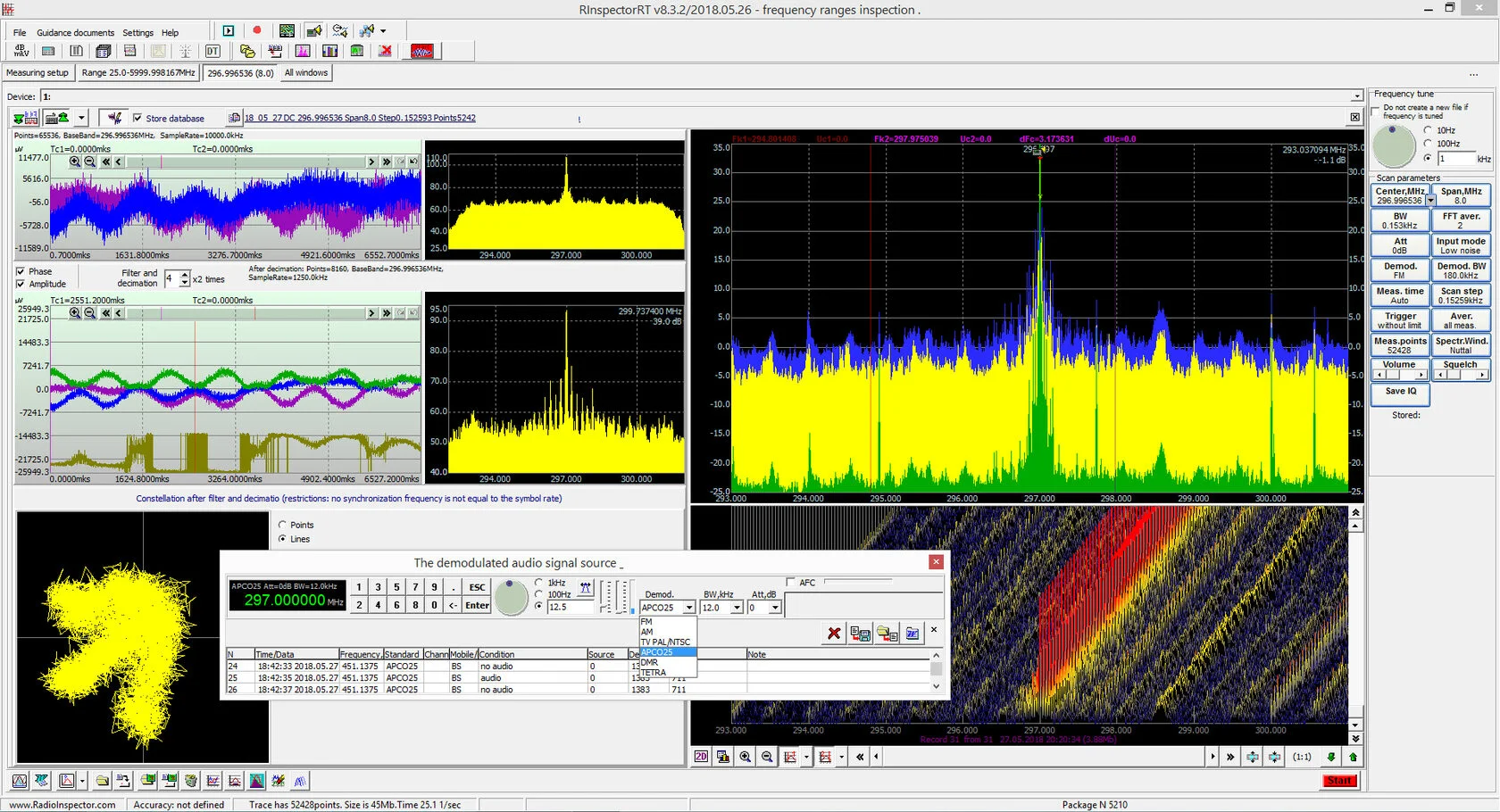 | tùy chọn kiểm tra | Xử lý và phân tích tín hiệu số. APCO-P25, DMR,TETRA, DECT, Bluetooth, 802.15.4(ZigBee, v.v.), 2G(GSM), 3G(UMTS), 4G(LTE), TV Analog(PALL/SECAM/NTSC), DVB -T2. Giải điều chế (trước khi nhận lưu lượng thoại) - APCO-P25, TETRA, DMR, FM, AM. Tiếp nhận tín hiệu TV: Analog TV:Pal/Secam/NTSC. Truyền hình kỹ thuật số: DVB-T2. Đối với Cassandra - Cassandra-K, Cassandra-S, Cassandra-SO, Cassandra-T, Cassandra-TM. R&S FSU, R&S ESU, R&S FSL, R&S EPL, R&S PR100, R&S EM100, R&S FSV, R&S FSQ, R&S FSW, R&S ESMD, R&S FSP. Chó săn tín hiệu USB-SA44B, Chó săn tín hiệu USB-SA124B, Chó săn tín hiệu BB60A, Chó săn tín hiệu BB60C, Chó săn tín hiệu SM200A. Anritsu MS27102A. Tektronix SA306B. NARDA NRA3000(6000), NARDA IDA3106. *FSU FSL FSQ FSW FSV ETL không hỗ trợ giải điều chế giọng nói APCO25 và DMR và luồng video TV analog. **PR100, EM100 không hỗ trợ giải điều chế luồng video TV analog (chỉ xác định và phân loại TV analog), giải điều chế DECT và Bluetooth. (!) Các hạn chế đối với các loại bộ giải mã hoạt động phụ thuộc vào băng thông của dữ liệu IQ và tính khả dụng của IQ trực tuyến trong mô hình đang được sử dụng. |